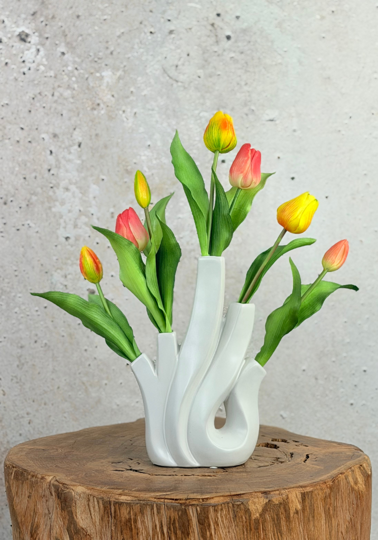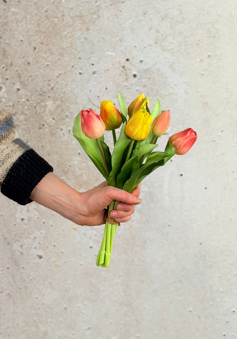 Este hermoso ramo de tulipanes de silicona es un producto fresco y alegre para colocar en tu hogar. El ramo está compuesto por 7 tulipanes de silicona que parecen y se sienten increíblemente reales.